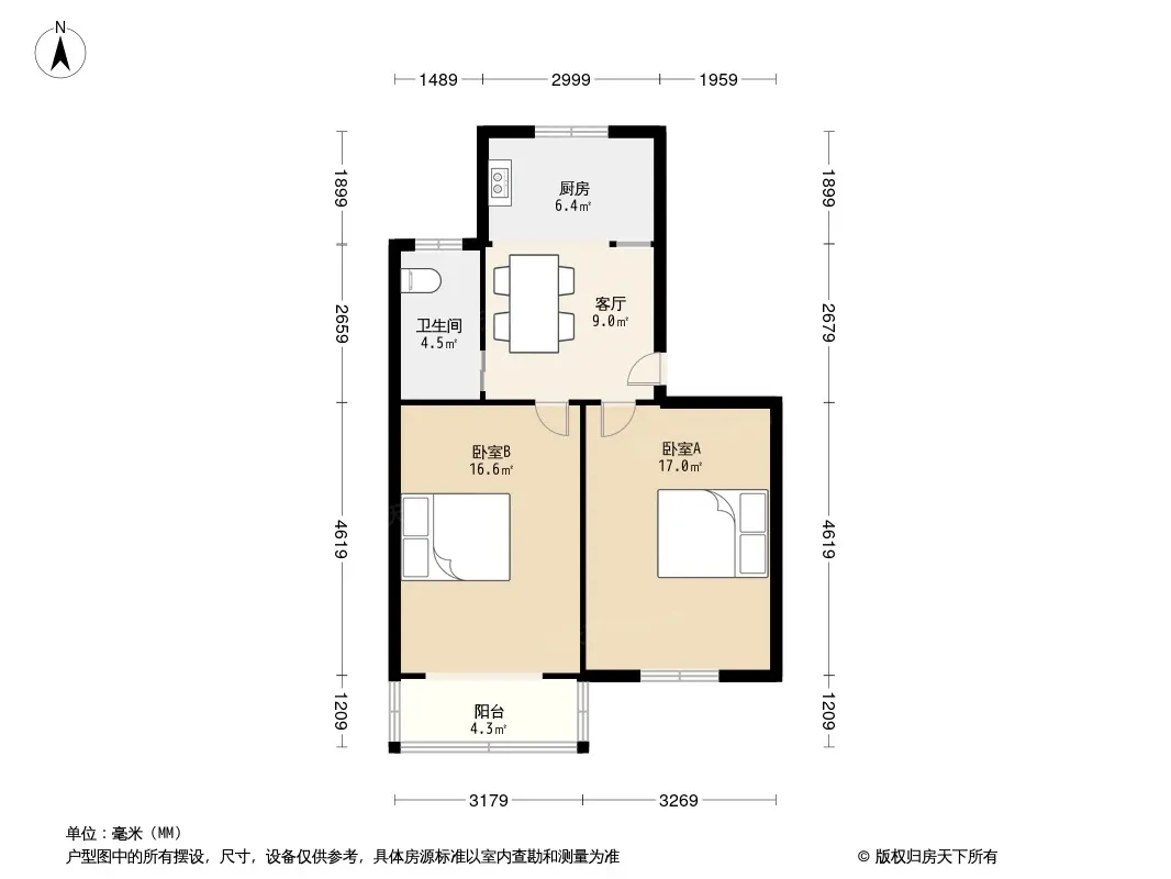 户型齐全,主打户型方正,明厨,客厅朝南,主卧朝南二居