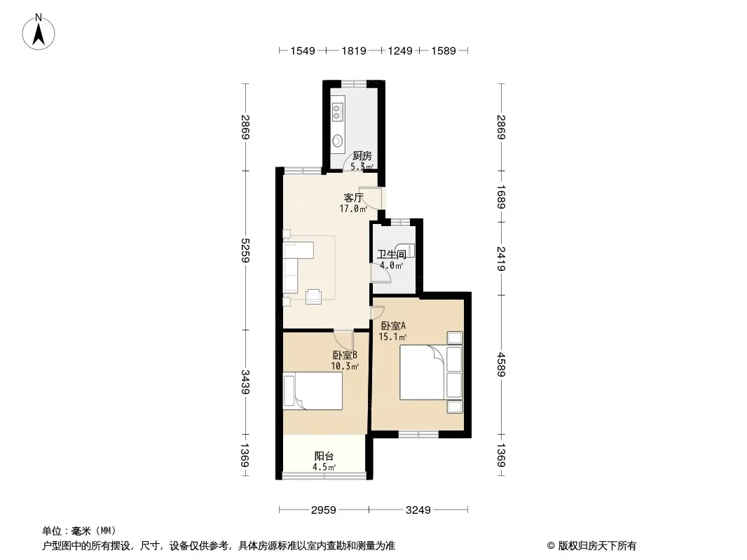 户型齐全,主打户型方正,明卫,明厨,客厅朝南,主卧朝南二居
