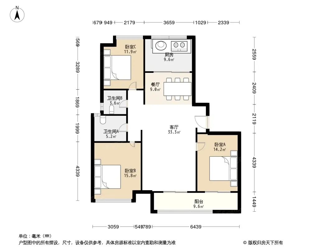 户型齐全,主打南北通透,主卧带卫,卧室带阳台三居