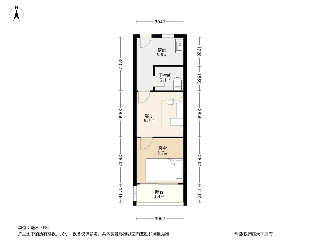 户型齐全,主打明厨,明卫,客厅朝南,全明格局一居