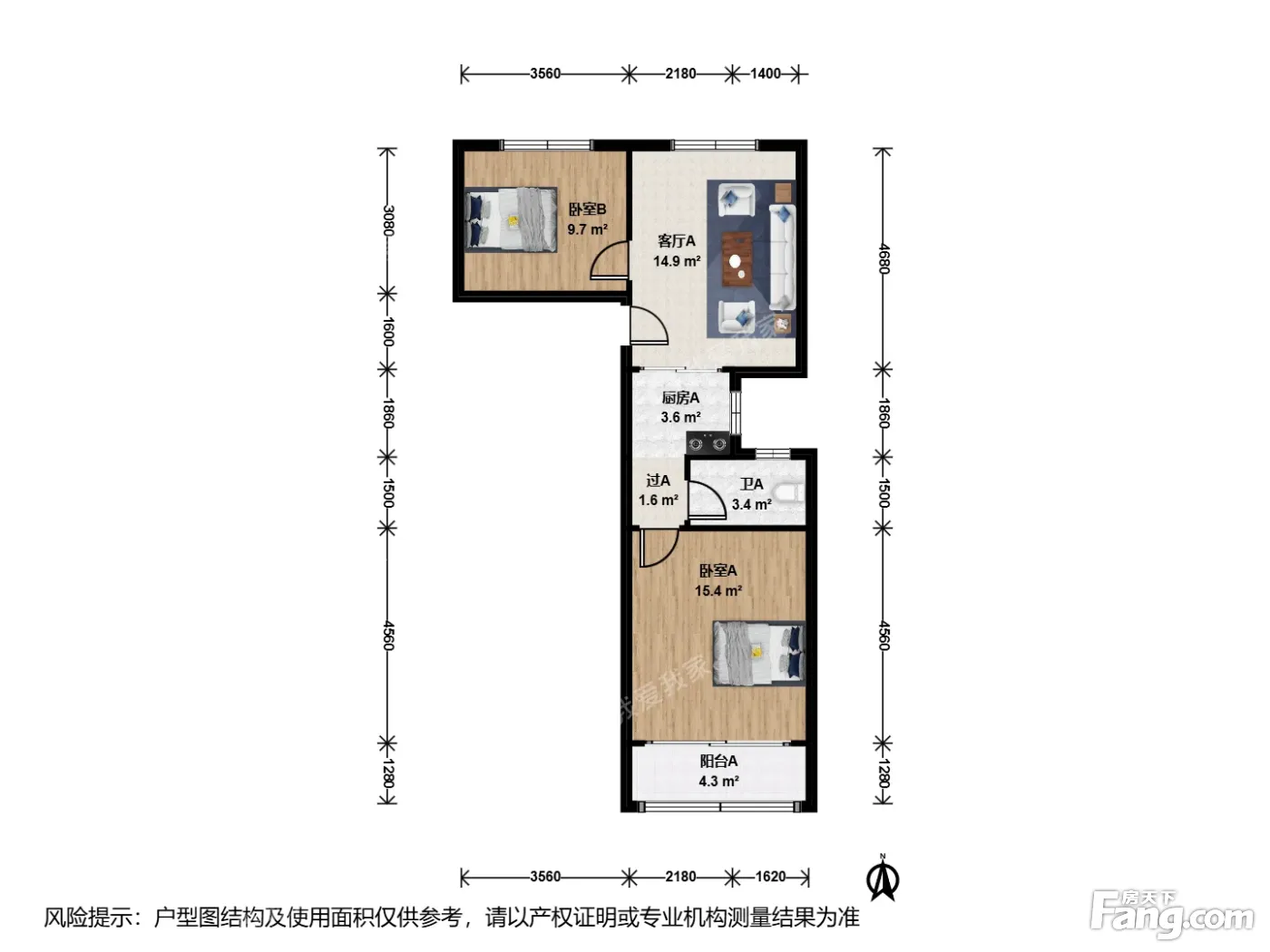 户型介绍:一房朝南一房朝北,厅朝北,边套全明户型