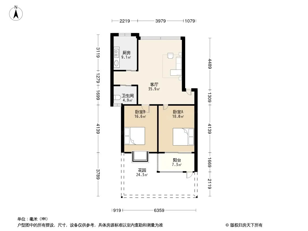 户型齐全,主打户型方正,明卫,明厨,客厅朝南,主卧朝南二居