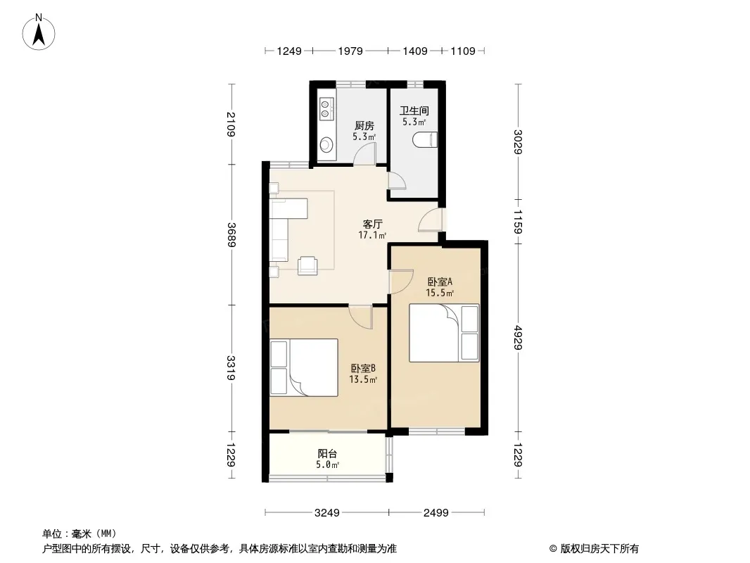 户型齐全,主打户型方正,明卫,明厨,客厅朝南,主卧朝南二居