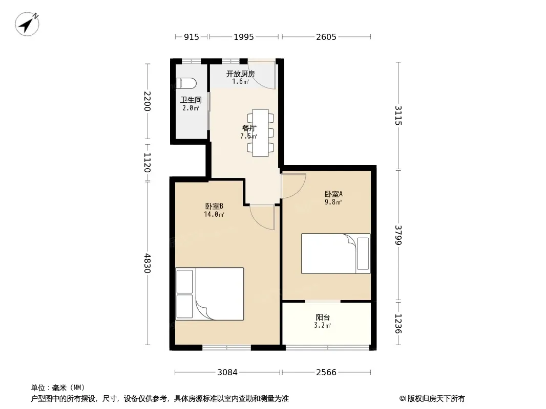 户型齐全,主打明卫,明厨,主卧朝南二居