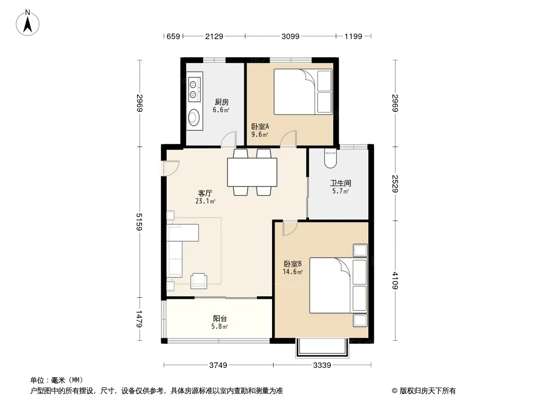 户型齐全,主打明厨,客厅朝南,主卧朝南二居