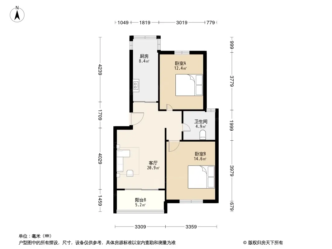 户型齐全,主打户型方正,明卫,明厨,主卧朝南二居