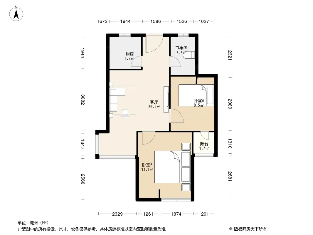 户型齐全,主打户型方正,客厅朝南,双卧朝南,主卧朝南二居