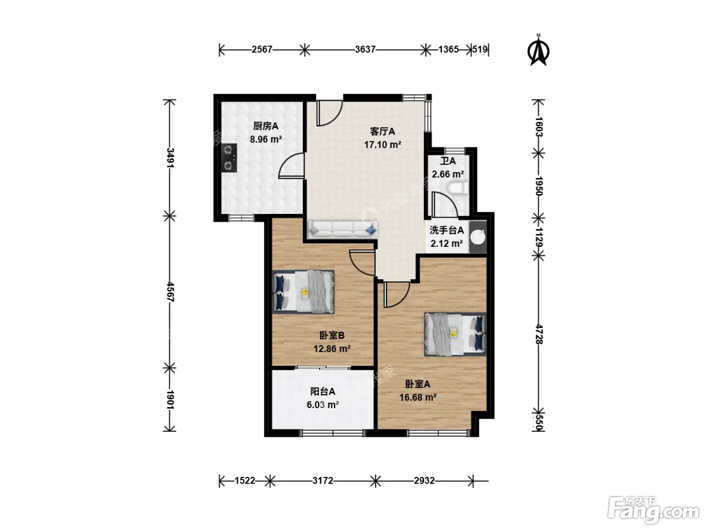 户型齐全,主打客厅朝南,带衣帽间,餐客分离二居
