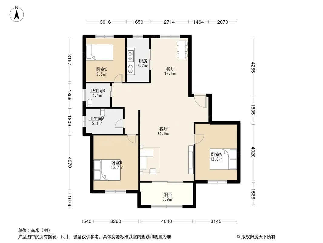 户型齐全,主打户型方正,明卫,明厨,独立衣帽间,双卧朝南三居