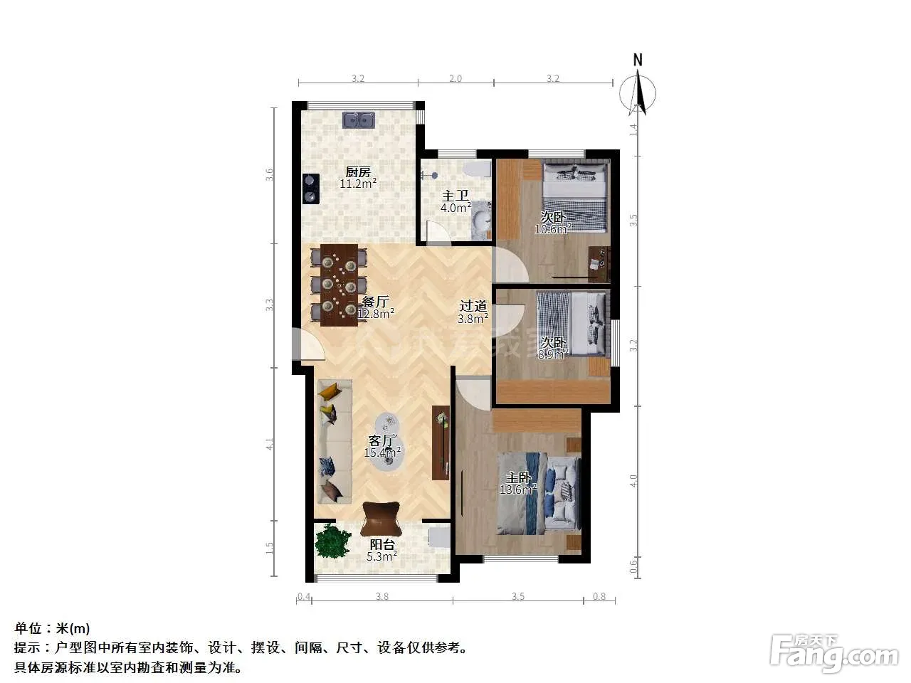 户型介绍:此房户型为3室2厅1卫,建筑面积为113平米,经典的南北户型