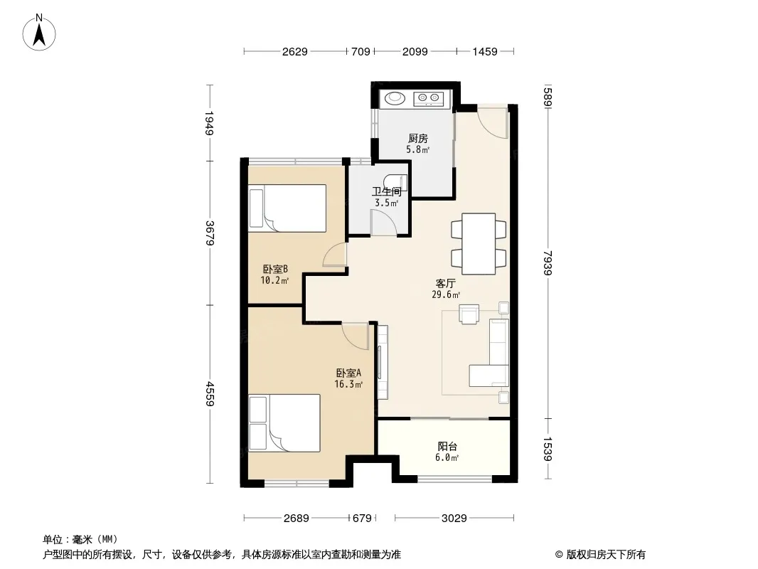 户型齐全,主打客厅朝南,卧室朝南二居