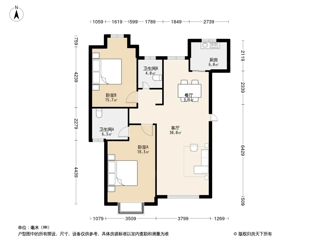 户型齐全,主打户型方正,明卫,明厨,主卧朝南二居