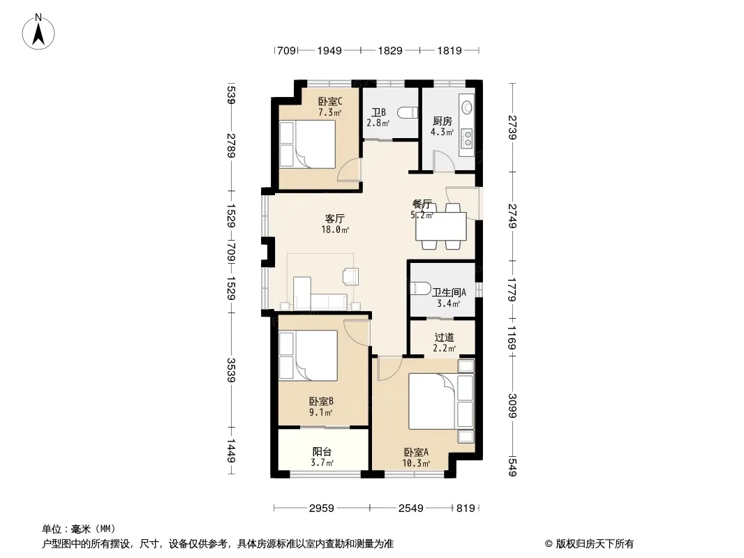 户型齐全,主打户型方正,明卫,明厨,客厅朝南,主卧朝南三居
