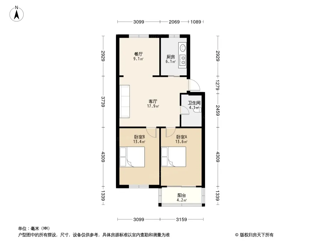 户型齐全,主打户型方正,明厨,客厅朝南,主卧朝南二居
