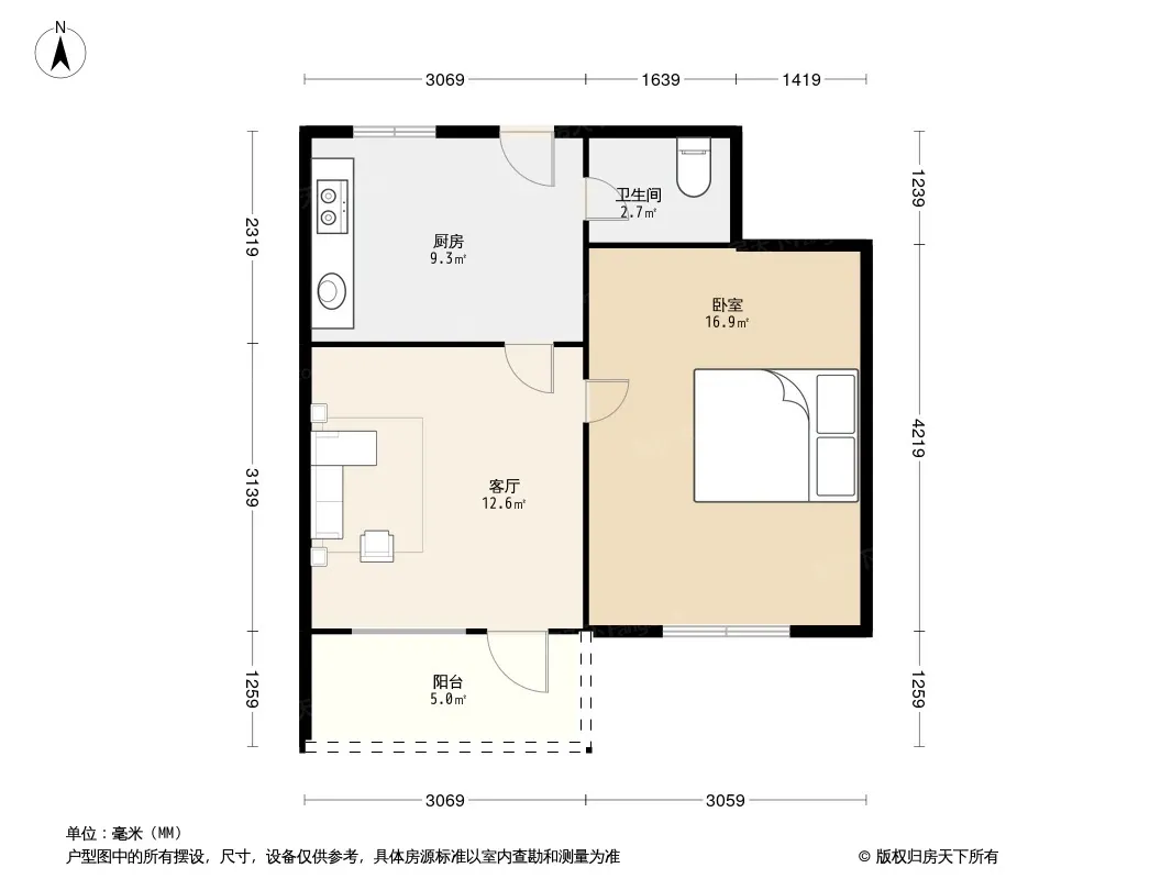 户型齐全,主打户型方正,明厨,客厅朝南,主卧朝南一居