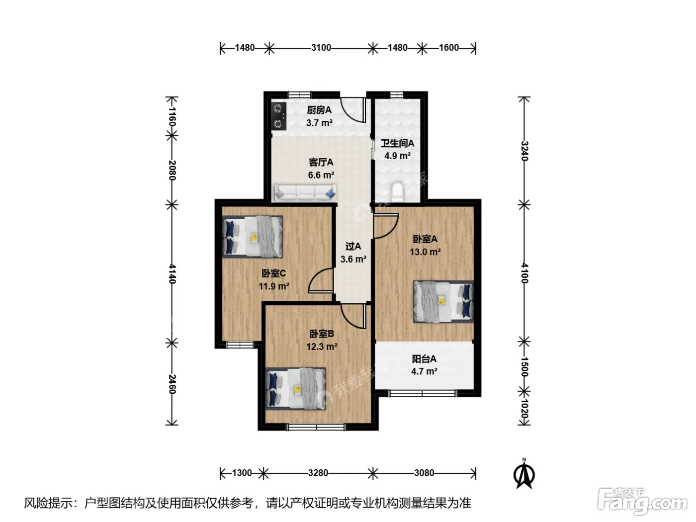 户型介绍:此房户型为3室1厅1卫,建筑面积为75.92平米,朝向为南北。