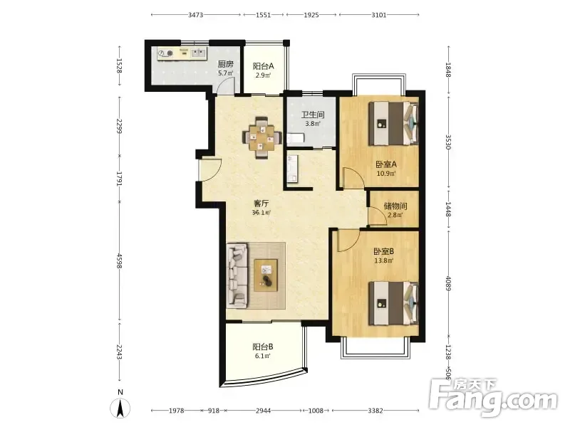 此套房型是2房2厅1卫,一个房间朝南,一个房间朝北,客厅南北通透,厨卫全明。