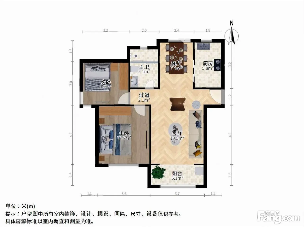 南北通透户型,主卧朝南、次卧朝北,厅南北通透,厨房和卫生间朝北,全明户型。