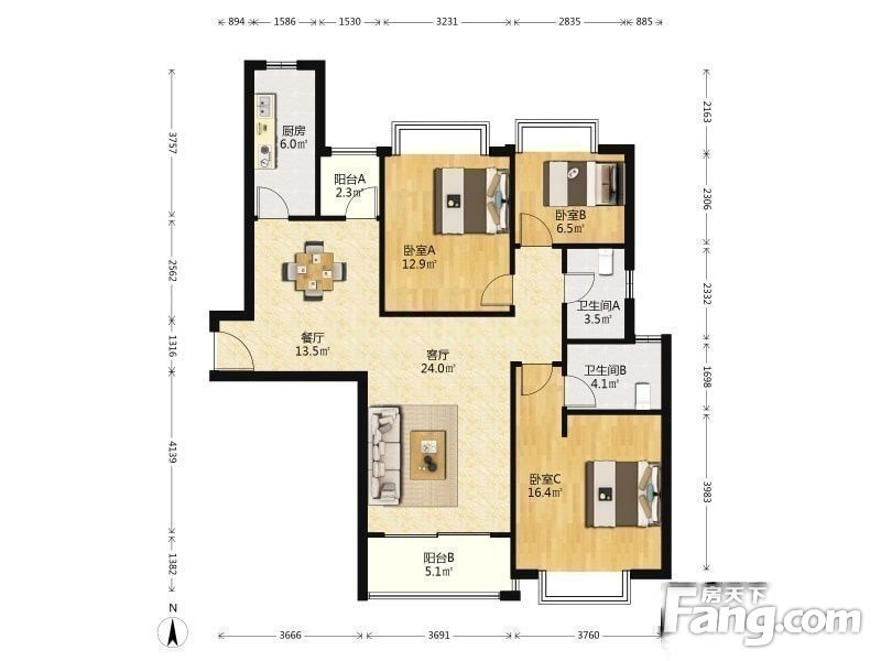 户型齐全,主打全明格局,户型方正,客厅朝南,主卧朝南三居