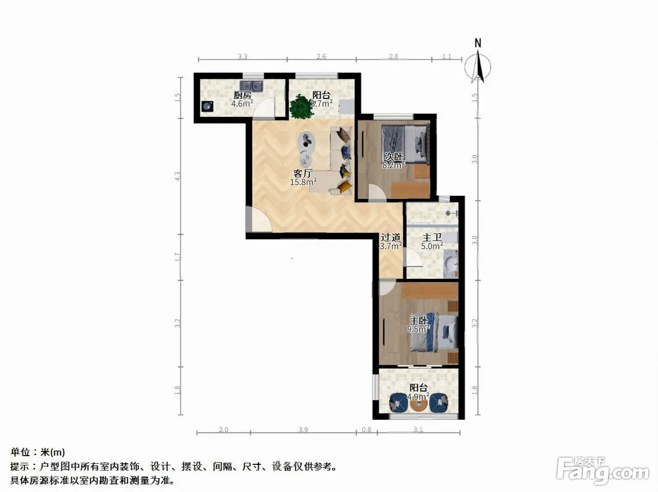 主卧朝南、次卧朝北,厅朝北,厨房和卫生间朝北,全明户型。