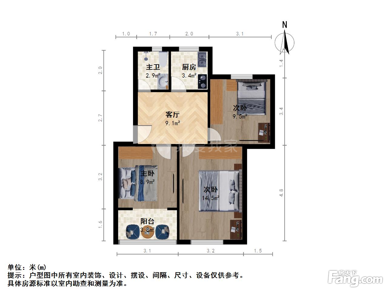 户型齐全,主打明卫,明厨,客厅朝南,主卧朝南二居