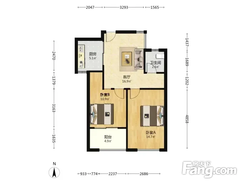 户型齐全,主打客厅朝南,带衣帽间,餐客分离二居