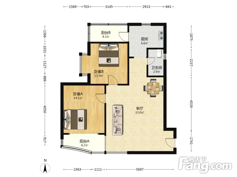 户型齐全,主打户型方正,明厨,主卧朝南二居
