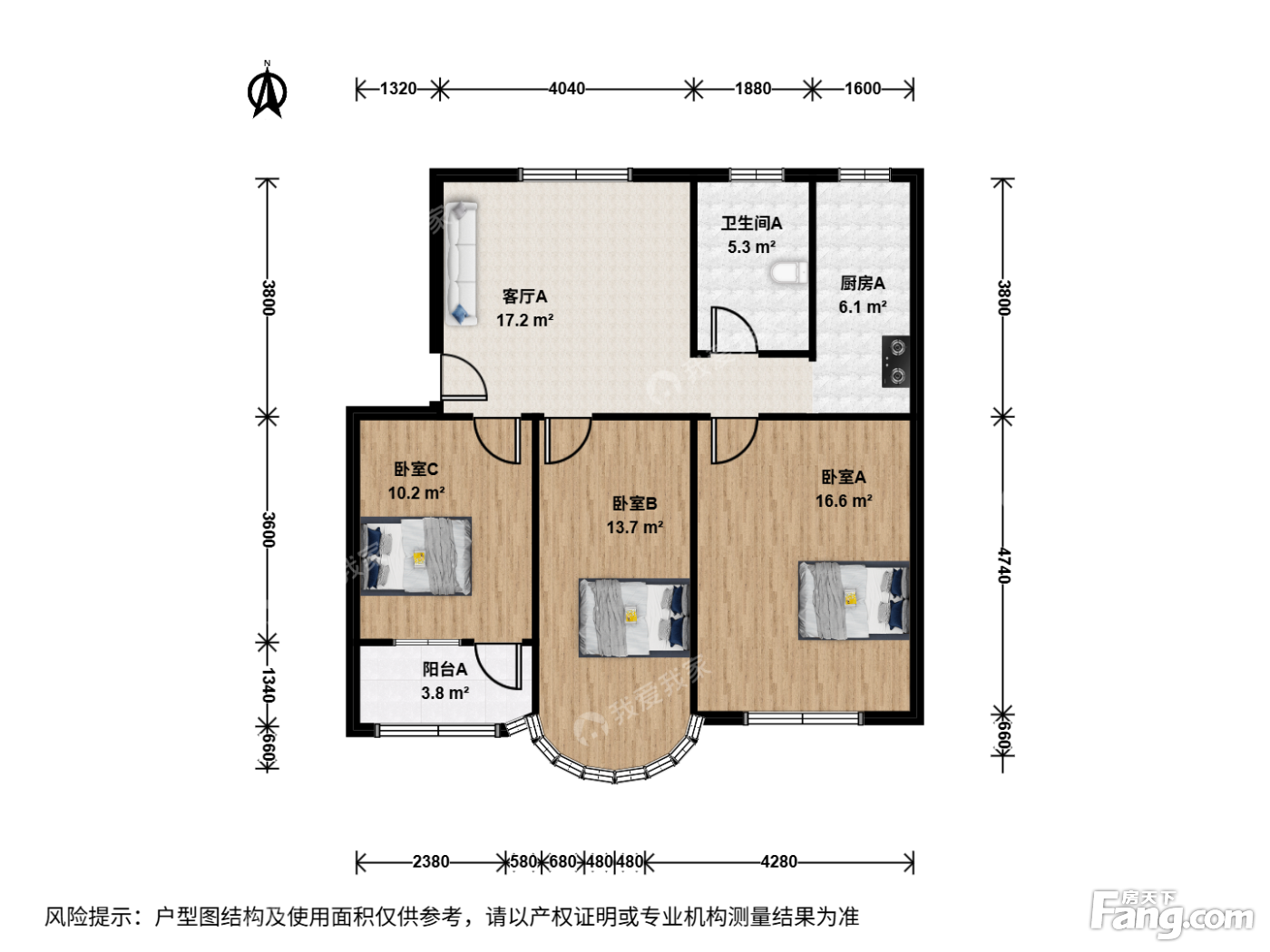 户型介绍:此房户型为3室1厅1卫,三个房间朝南,厅朝北,厨房卫生间朝北,全明户型