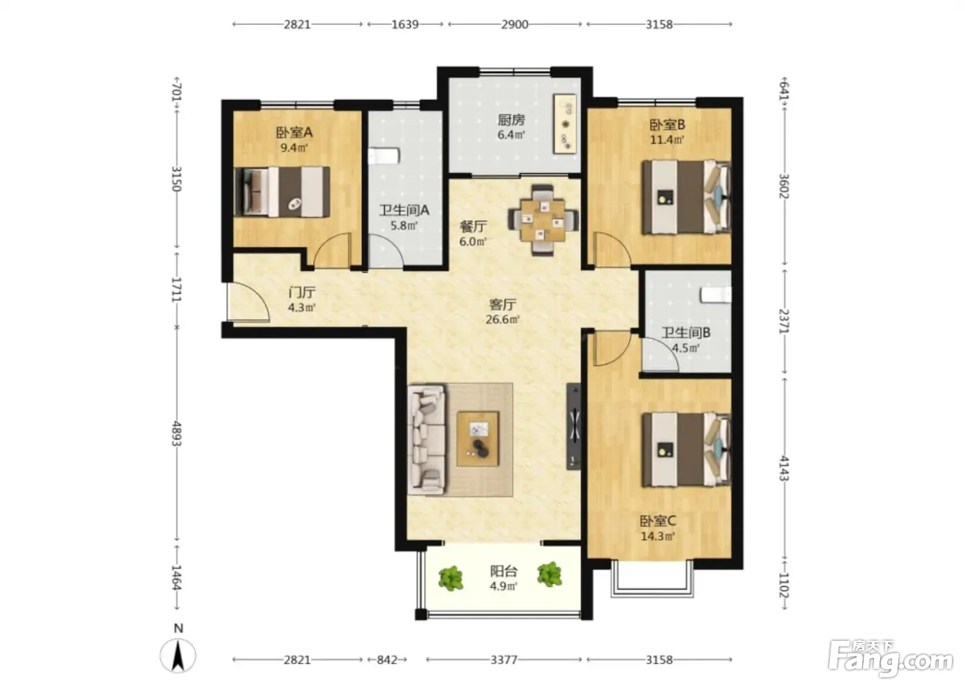 户型齐全,主打南北通透,主卧带卫,主卧朝南,卧室带阳台三居
