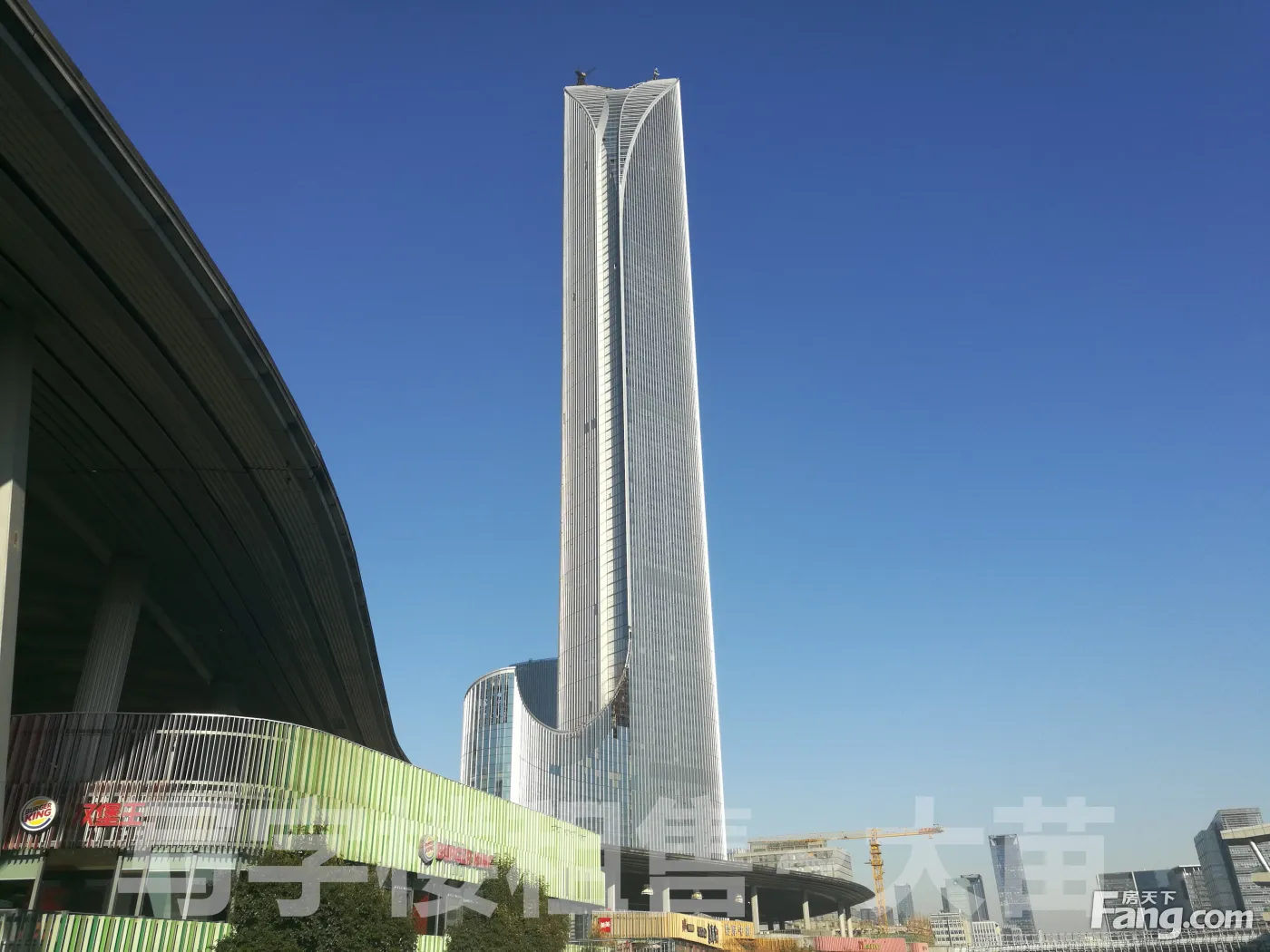 ,江苏一座结构400米以上的高楼 2、中国地级市中一座高层 3、江苏地区个在软土地基上建造的65万吨级的单体建筑 4、江苏地区一次进行超高标号超高压一泵到顶的泵送施工 5、为满足异形截面施工要求,在400米高空对低位顶升模架体系进行片状分离拆改,属华东地区一次 6、经过复杂力学设计,在410米超高位置顶模平台上搭设扣件式钢管脚手架完成剩余剪力墙施工,为江苏一次。 苏州IFS,450m重塑城市封面,苏州国际化形象的集合体。这座城市新地标的高层物业,荟萃了一系列国际水准的前沿物业:“湖畔平层”酒店式公寓、“云顶无界墅居”空中别墅、天际奢华酒店NICCOLO、“旗舰办公”甲级写字楼。 T1:地下5层,地上128层,高达450米,全球超高层可售住宅二高、八高、江苏省一高楼。住宅面积100-550平米; T2:地上14层,总建筑面积17500平米。 T3:地上13层,总建筑面积26000平米,由L1写字楼大堂与商业,L2-L13甲级写字楼组成。位于金鸡湖CBD核心的位置,周边集聚各类金融机构、跨国企业等,将成为全球跨舰企业。