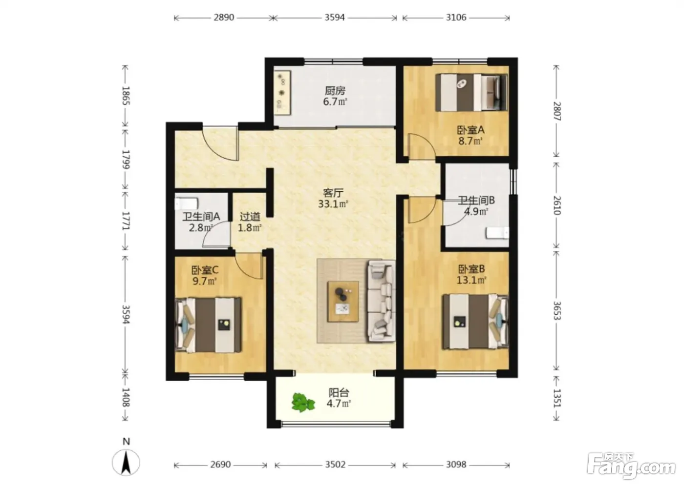 户型齐全,主打客厅朝南,卧室朝南三居