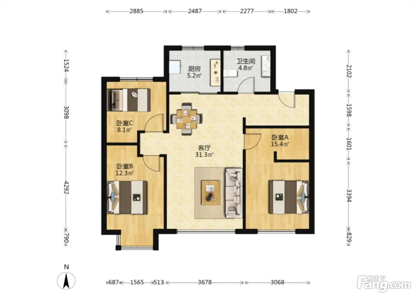 户型齐全,主打南北通透,全明格局,户型方正三居