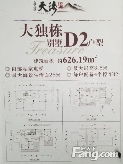 《京基天涛轩》山海独栋,户户大花园,游泳池,海景独栋别墅。 A户型398平上下四层,私家泳池,私家独立电梯,实用面积1000平,送花园面积200平,售价2880万。 D户型593平上下三层,私家泳池、私家电梯,面宽20米,实用1500平,送花园600平,售价5800万。 B户型655平上下五层,主副楼设计,实用面积2500平,私家双泳池、私家电梯,送花园1000平,售价8000万。
