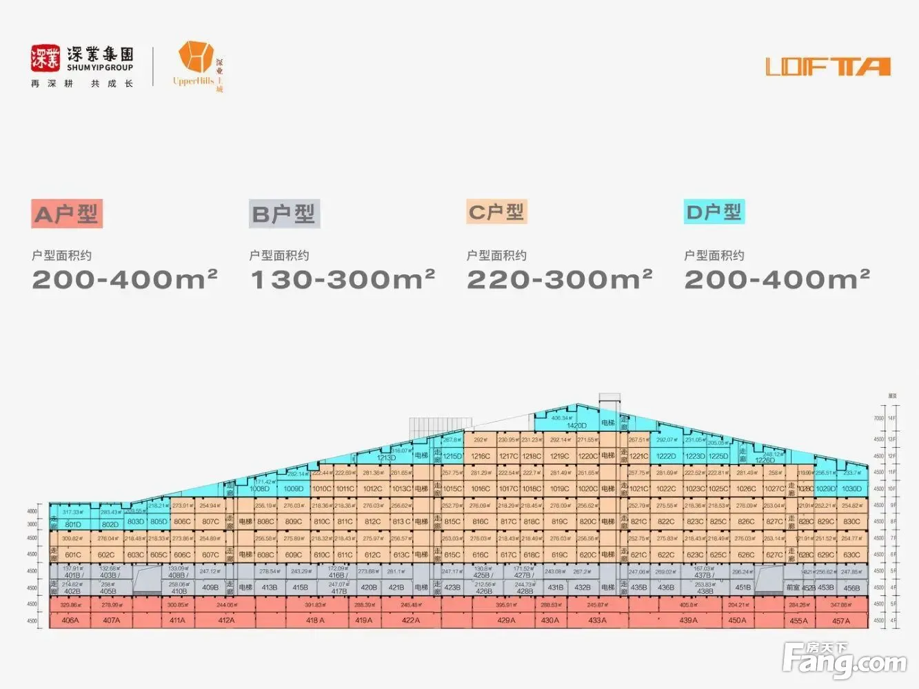 【项目基础信息】 总建筑面积:32542.74㎡ 建筑层数:14层/高75m/长220m 开发商:深业置地 土地年限:/2012-2062年 土地性质:产业研发 可售楼层:4-14层 可售套数:130套 产品户型:、、、类 推售面积:120-410㎡ 主力户型:200-300㎡ 使用率:84% 联排独栋: 产品:复式双层,标准4.5米、双层通高9米 专属配套:专属电梯厅、停车位268个、车位比1:2 交付标准:毛坯交付 物业公司:深业物业 管理费:15元/㎡ 空调系统:自装空调计电费