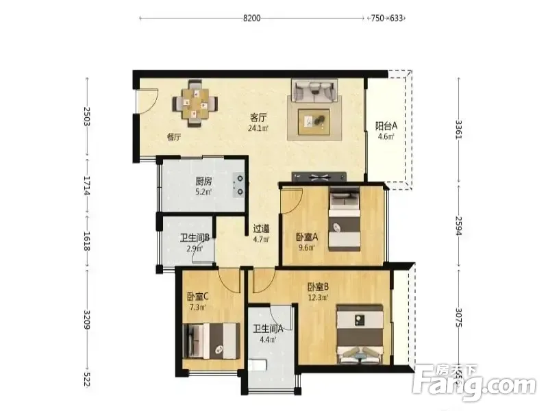 户型齐全,主打户型方正,明卫,明厨,客厅朝南,全明格局三居