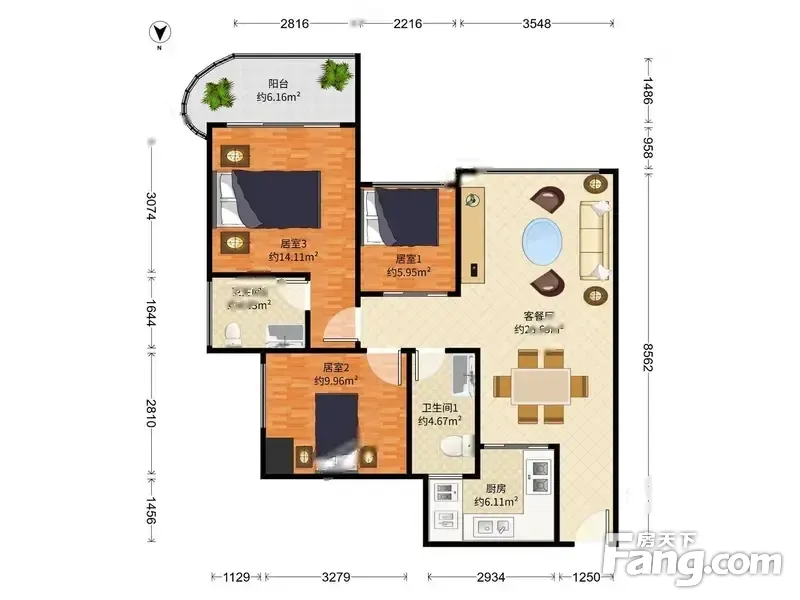 户型齐全,主打户型方正,明卫,明厨,客厅朝南,全明格局三居