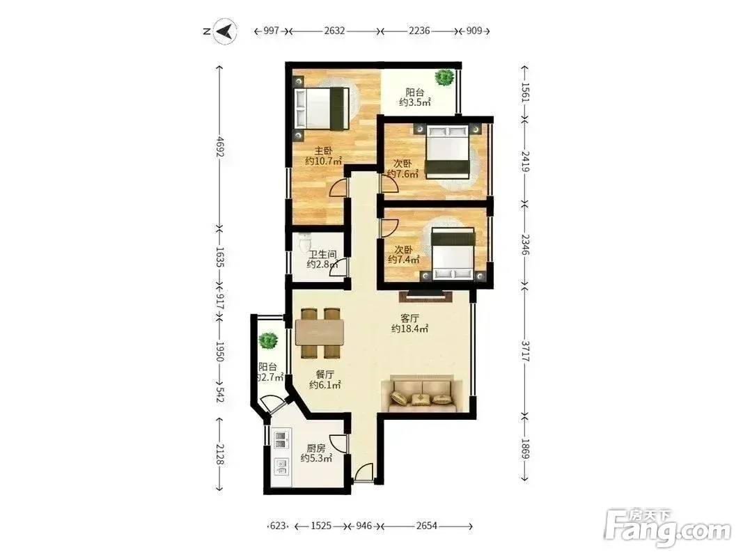 户型齐全,主打明厨,明卫,客厅朝南,双阳台,双卧朝南三居