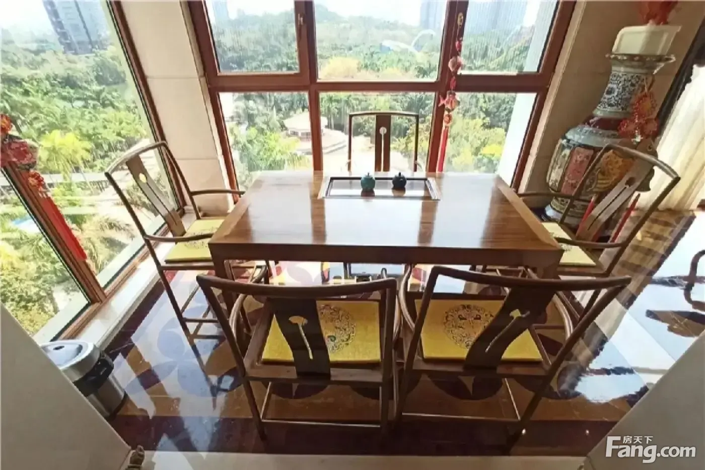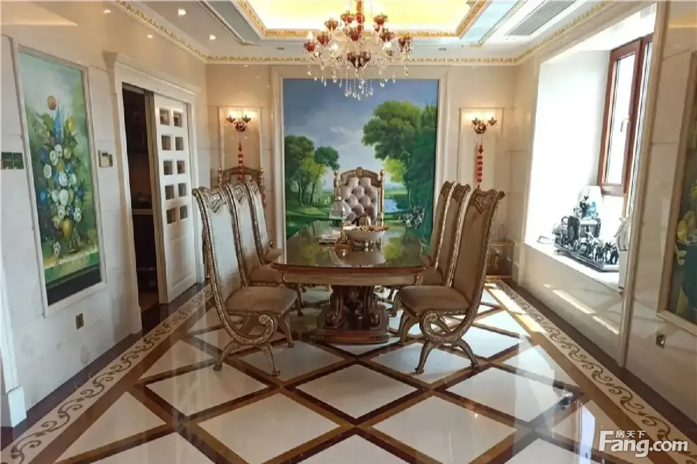 户型描述 【1】使用面积320平,三层复式,客厅近5米挑空,3房三厅4卫,三套房,满足了家人不同的住房需求,避免互相打扰。 【2】二层入户,入户是一个大多功能厅,有两个大套房,其中一个套房带书房。 【3】沿入户右侧楼梯下一楼是餐客厅,餐厅在左,客厅在右,餐客厅朝南,客厅挑空,与阳台连通,宽敞开阔,餐厅北侧是公卫和方正厨房。 【4】沿入户右侧楼梯上三楼是大主卧套房,带大衣帽间。 【5】整体上以二层为中间位置,分为上下两个部分,平时互不打扰,在一层客厅看电视不会打扰二层三层家人的休息。在用餐时相聚于餐厅,其乐融融。这种设计既保留了家人齐聚的圆满,又给予了个体私密空间。 景观特点 北向观社区园林,24万平大社区园林绿化景观。 南向正对4万平天鹅湖,24万平燕晗山郊野公园,深圳欢乐谷,视野开阔。 装修特点 1、装修风格:奢华欧式精装修。 2、装修时间:2010年左右全新装修。 3、装修选材:精选高品质材料,瓷砖用的是莎安娜米黄的瓷砖,施华洛世奇的水晶灯点缀,屋顶采用24K铂金镶边,一手装修花费近千万,装修保养好,可以拎包入住。 保养状况 业主装修后,一直,住的人很少,保养非常不错,可拎包入住,无需翻新