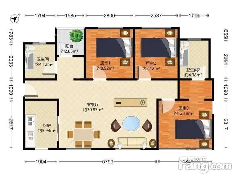 万科麓城三期 3房2厅2卫 88.57㎡