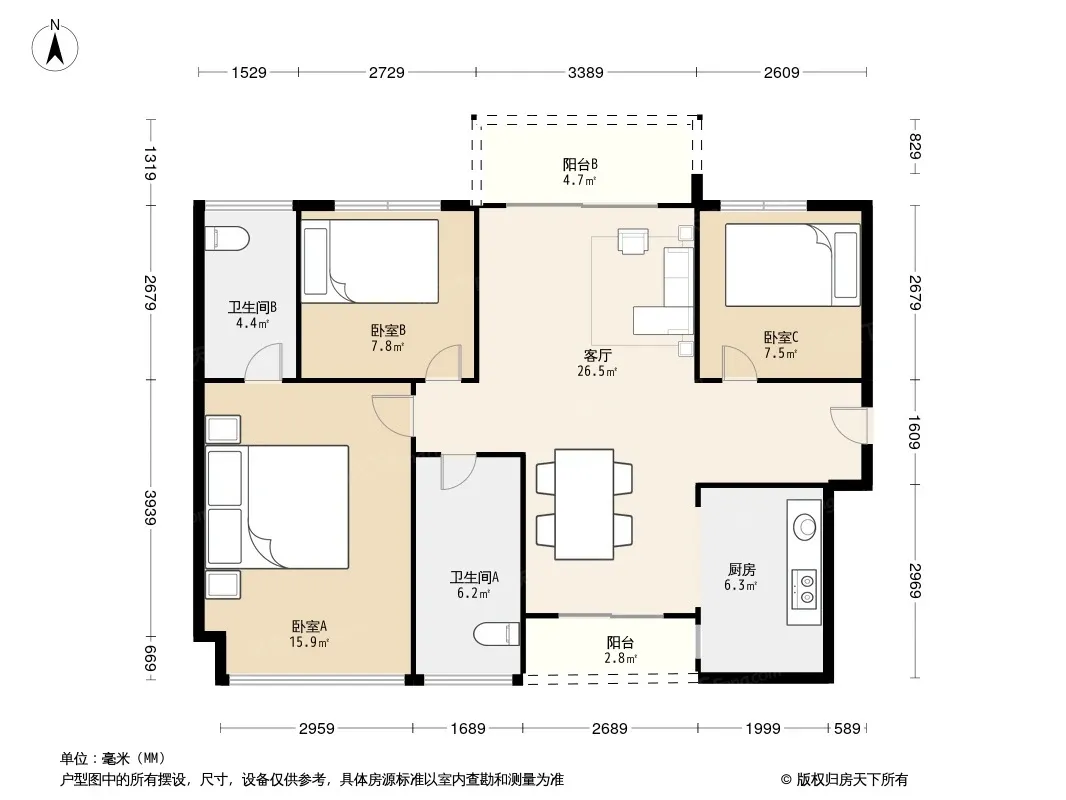 户型齐全,主打明卫,客厅朝南,双阳台,主卧朝南三居