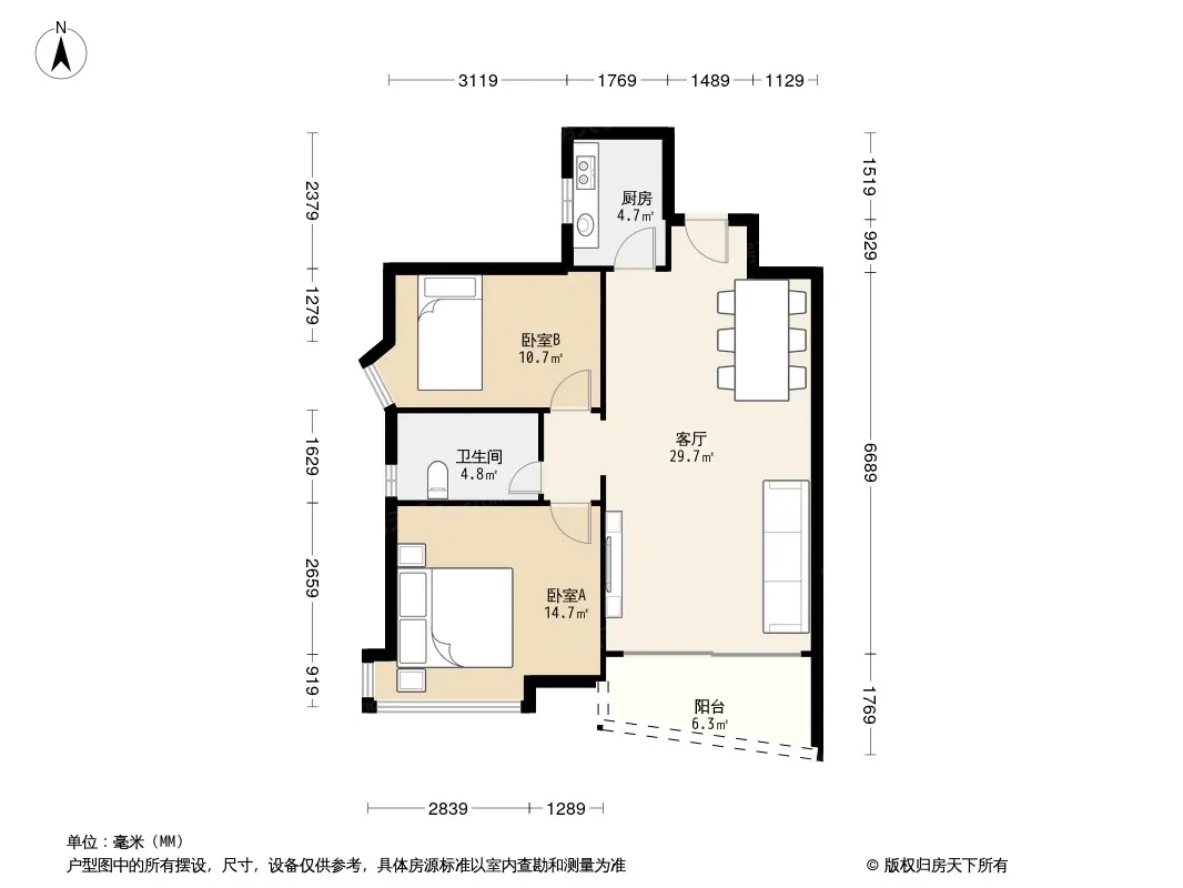 户型齐全,主打户型方正,明卫,客厅朝南,双阳台三居
