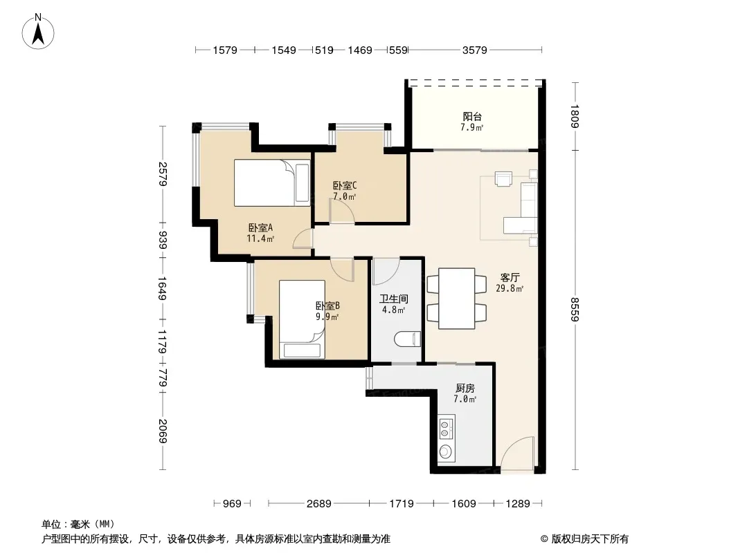 户型齐全,主打明厨,独立衣帽间,客厅朝南,双卧朝南三居