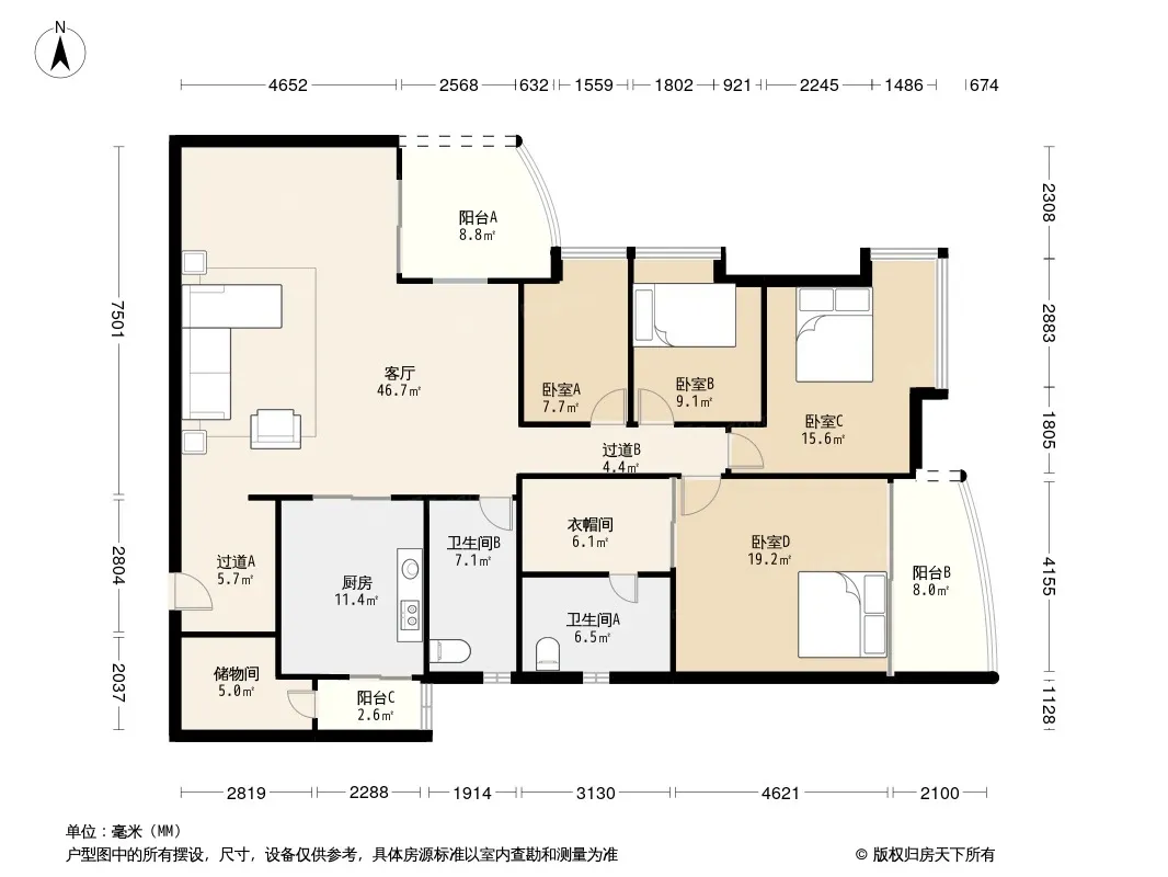 户型齐全,主打明卫,独立衣帽间,双阳台四居