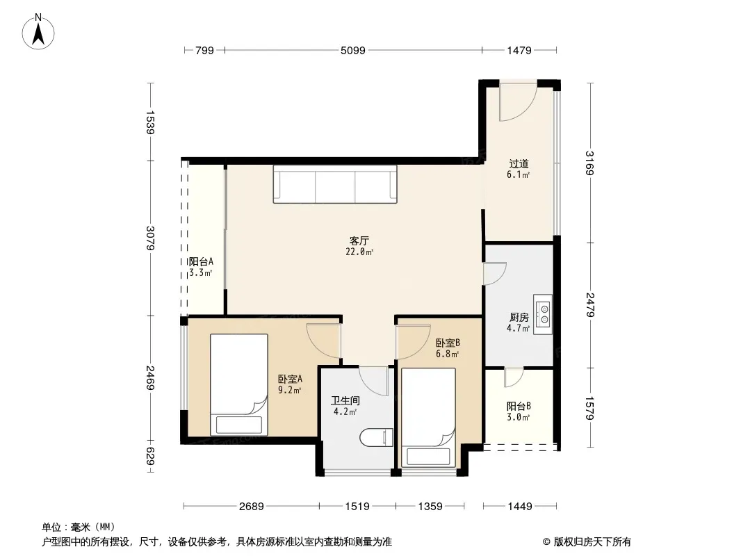 此房正规二房,朝南,户型方正双阳台设计。