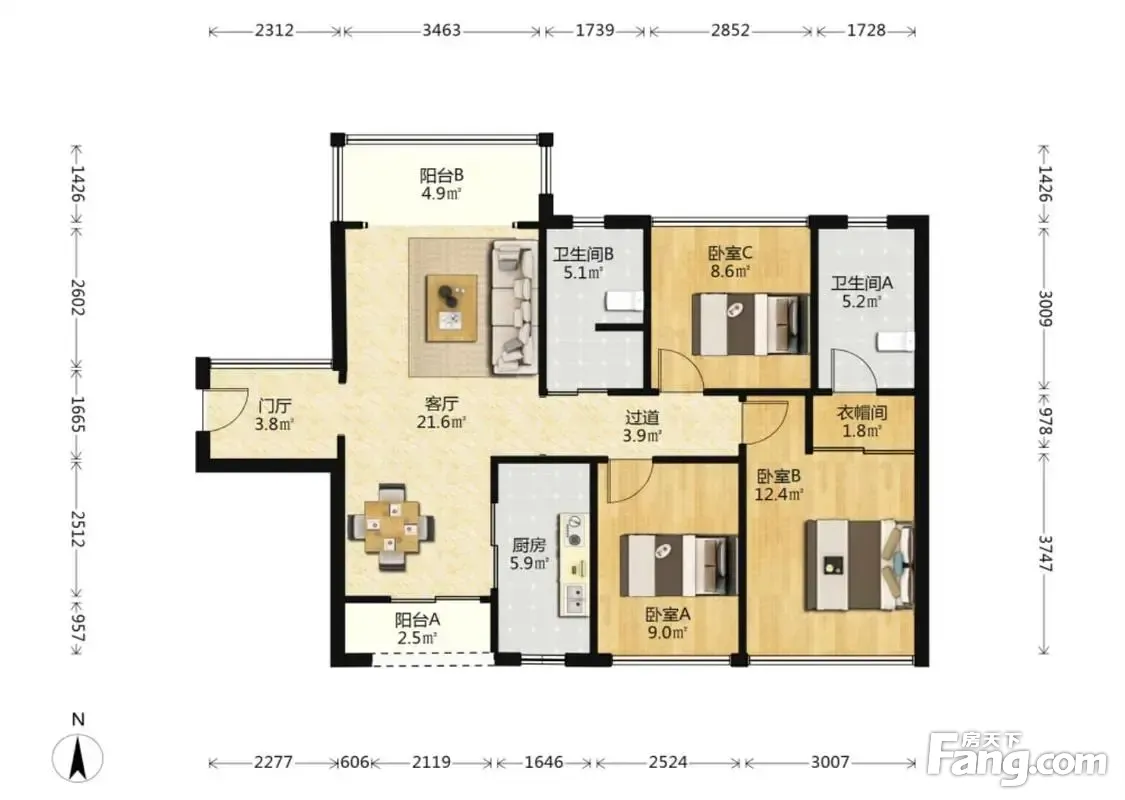 户型齐全,主打全明格局,户型方正,动静分离,主卧套间,独立衣帽间,L型厨房,大面宽阳台三居