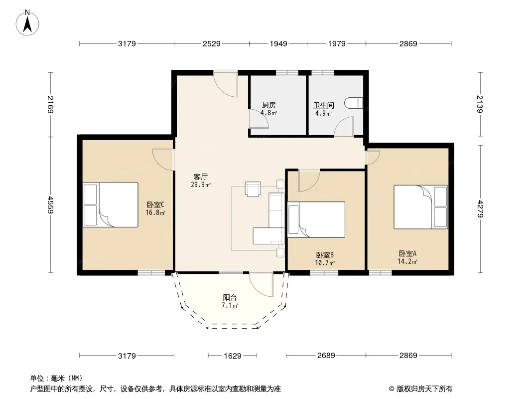 户型齐全,主打明卫,明厨,客厅朝南,全明格局三居
