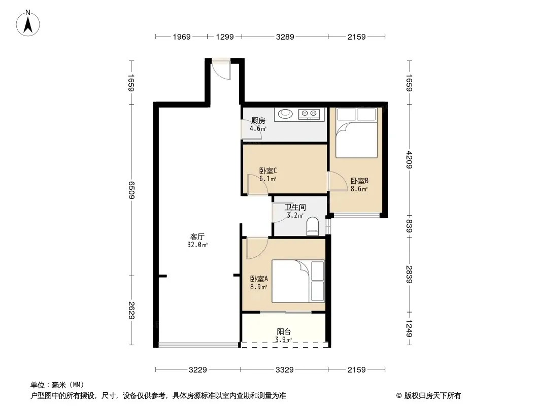 户型齐全,主打明卫,客厅朝南,双阳台三居