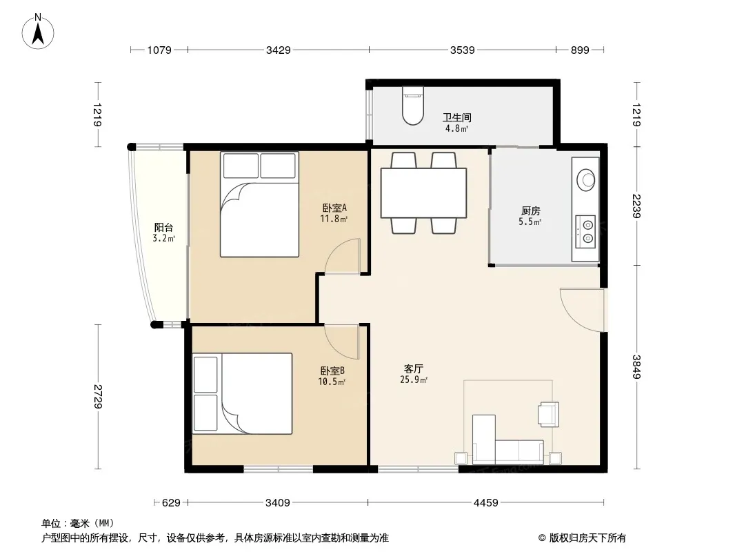 户型齐全,主打明卫,明厨,客厅朝南,双阳台三居