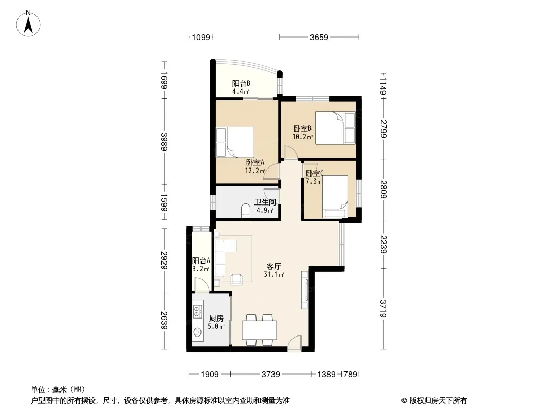 户型齐全,主打明卫,客厅朝南三居
