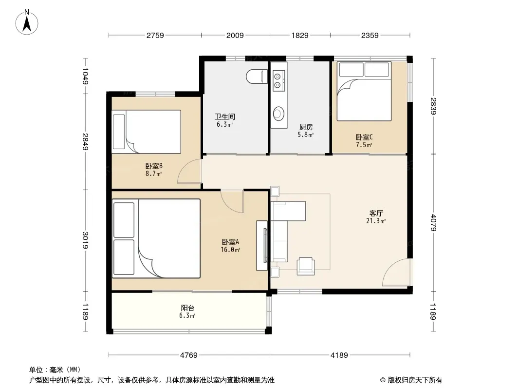 户型齐全,主打户型方正,明卫,明厨,客厅朝南三居